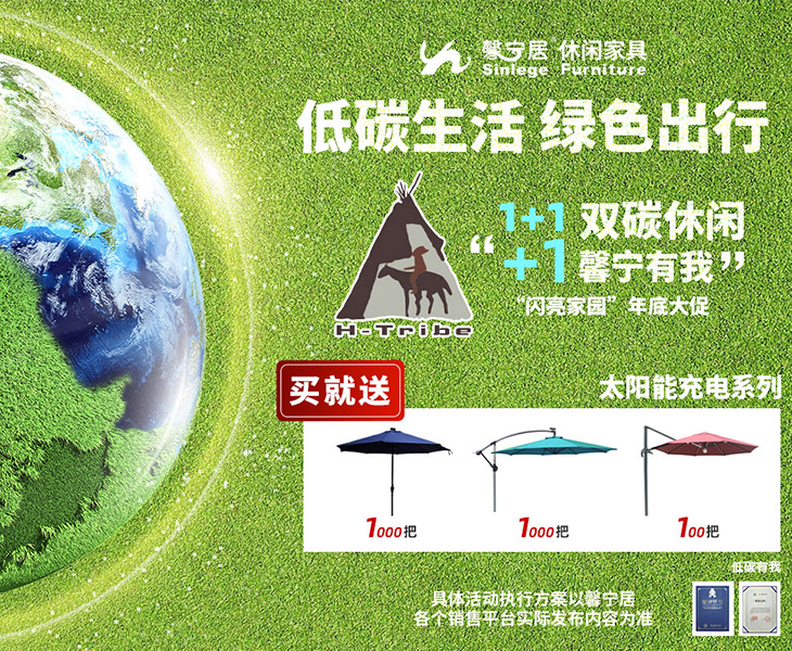 為積極響應國家“雙碳”戰略,倡導“低碳出行,綠色休閑”。我們 馨寧居公司將拿出“1000把太陽能中柱傘、1000把太陽能香蕉傘、100把太陽能旋轉傘”,面向國內市場開展“1+1+1雙碳休閑,馨寧有我”閃亮家園活動,即消費者購買馨寧居桌椅產品在原銷售價格不變的前提下,馨寧居公司將免費贈送并推廣這些太陽能遮陽傘。