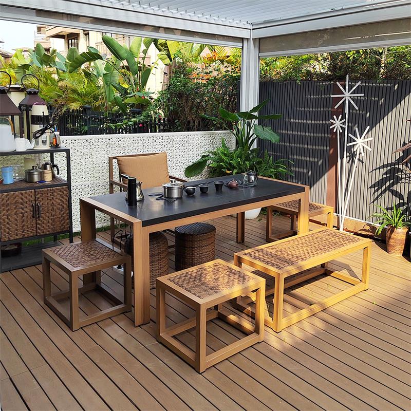 該系列產(chǎn)品主要以仿木鋁合金輔以部分仿藤和當前時尚流行的包芯真空帶搭配,配以時尚布藝元素,云夢椅、云夢亭、“道德經(jīng)、蓮年如意”硯石茶臺,茶余飯后,休閑生活新方式,帶給消費者不一樣的休閑生活體驗。