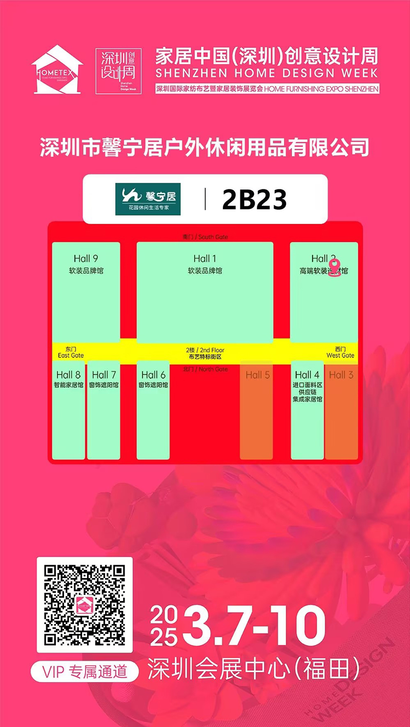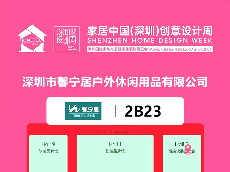 3月7-10日,2025家居中國(深圳)創意設計周暨深圳國際家紡家居展,將在深圳會展中心(福田)盛大舉行,13萬展覽面積,1000多家品牌企業集結,12萬余家居及跨界買家聚焦深圳。錦若繁華,璀璨綻放,馨寧居休閑家具2號館2B23展臺,歡迎蒞臨!