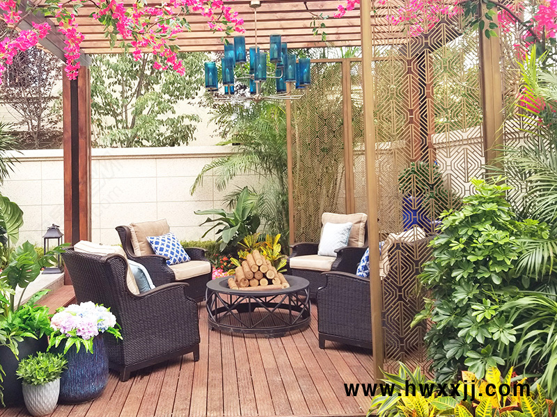 為了享受到這種自然放松的感覺,在庭院設計中,我們要學會規劃有限的面積,使用戶外家具、花槽花架、秋千椅、圍欄等元素,打造溫馨、舒適、自然、和諧的氛圍。使用植物來營造納涼好去處無疑是這個季節里最好的選擇,滿園綠色本身就能從視覺上給人一種放松的感覺。