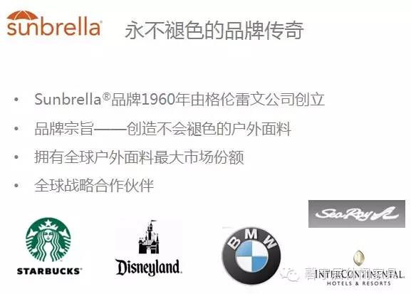 Sunbrella(賽百綸),國際知名居面料品牌,擁有全球戶外面料最大市場份額,1961年由格倫雷文公司(GlenRaven Inc)創立。同時也是馨寧居布料供應商合作伙伴,全球各大高端品牌都使用過Sunbrella產品,馨寧居更是帶著Sunbrella走入了每一時尚休 閑領地。