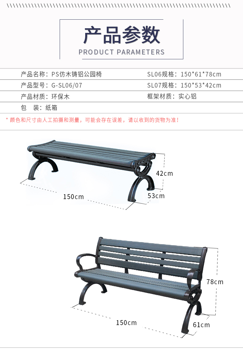 馨寧居休閑公園椅采用的材質是PS木環保木、碳纖維、鑄鋁椅腳。經久耐用、仿木紋的質感、超強的耐腐蝕等優等特點。