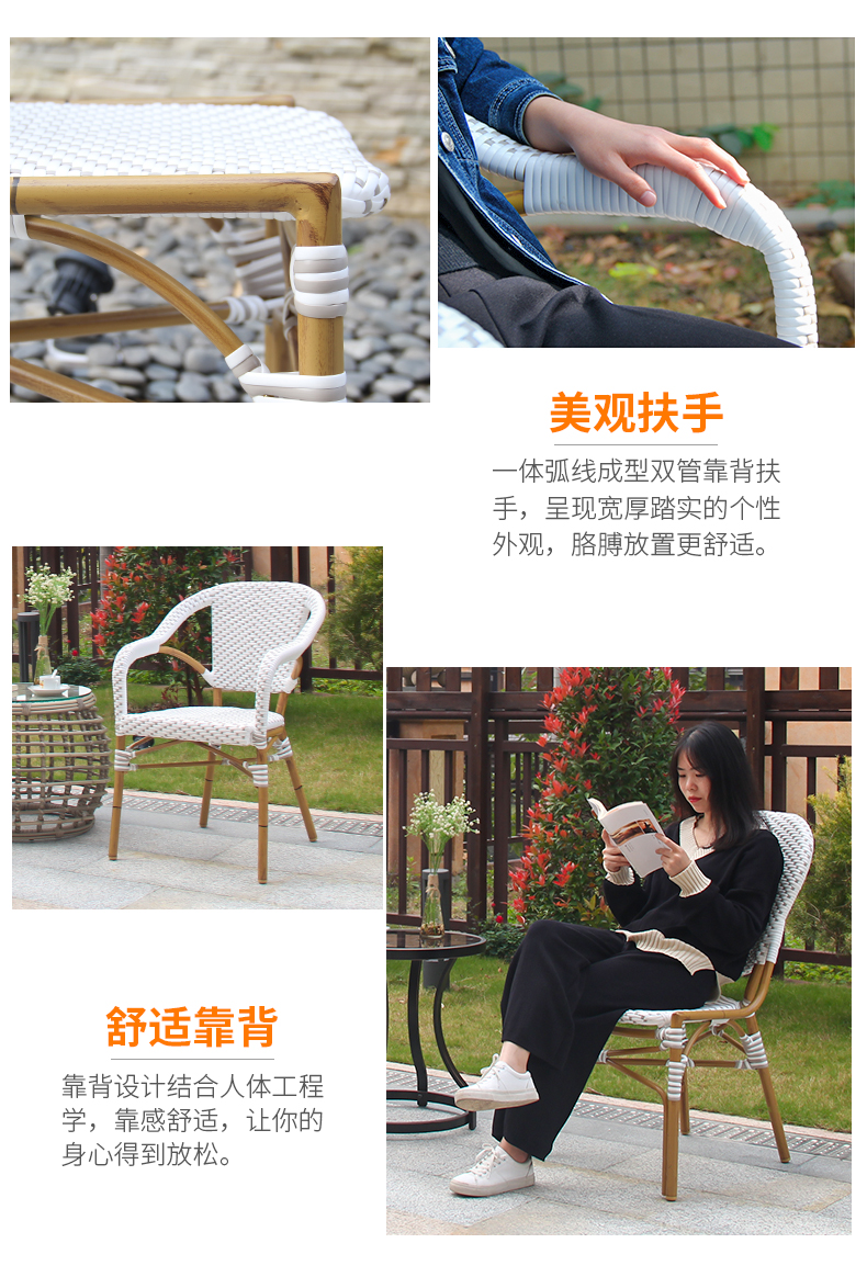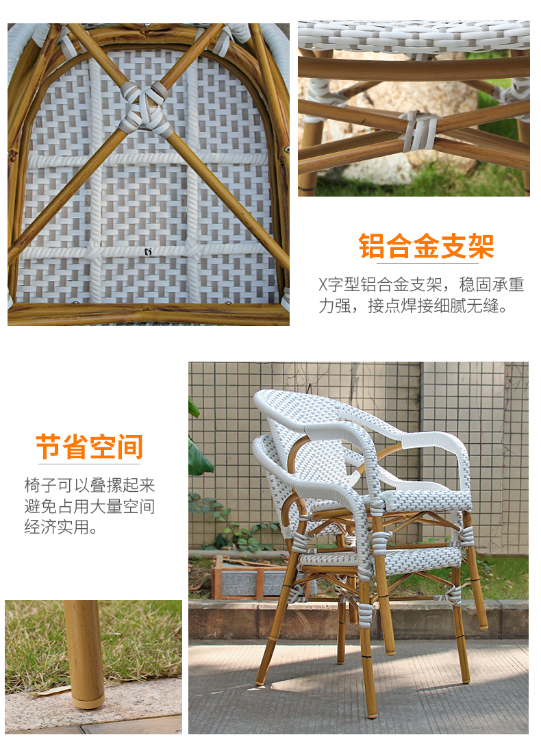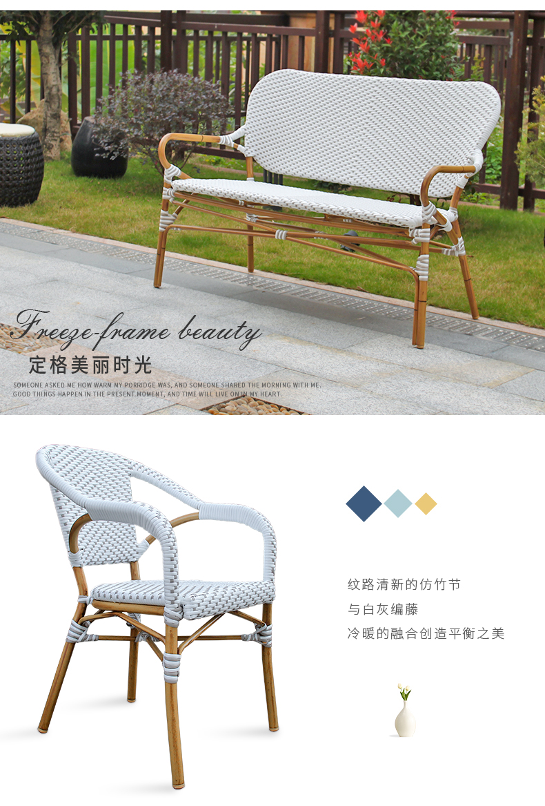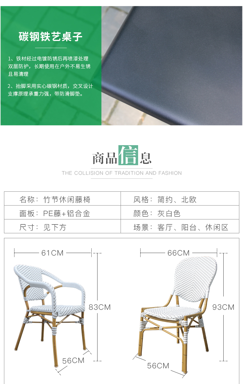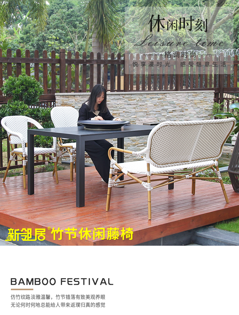 - 材質(zhì):鋁合金框架,仿竹紋處理,PE藤編